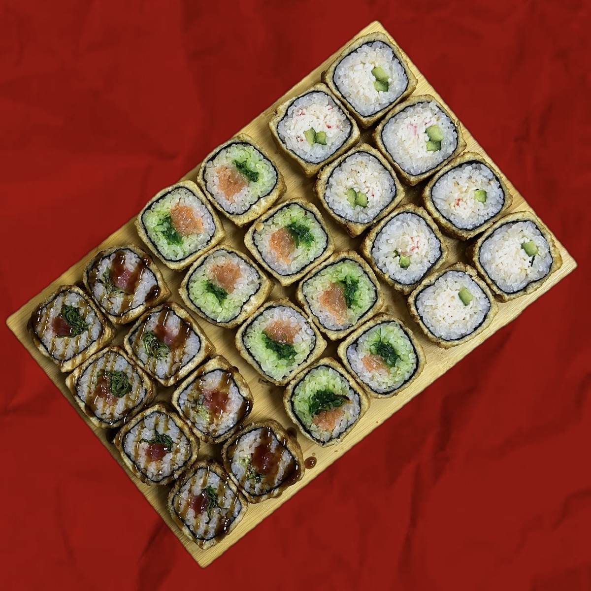 ДИНАМИТ - нори,рис,чукка,лосось с/с,кляр,панировочные сухари; ШИФУ - нори,рис,тунец, лист салата,соус спайс,унаги соус, кляр,панировочные сухари; КАНИ ТЕМПУРА - нори,рис,снежный краб,соус спайс,огурец,кляр,панировочные сухари;